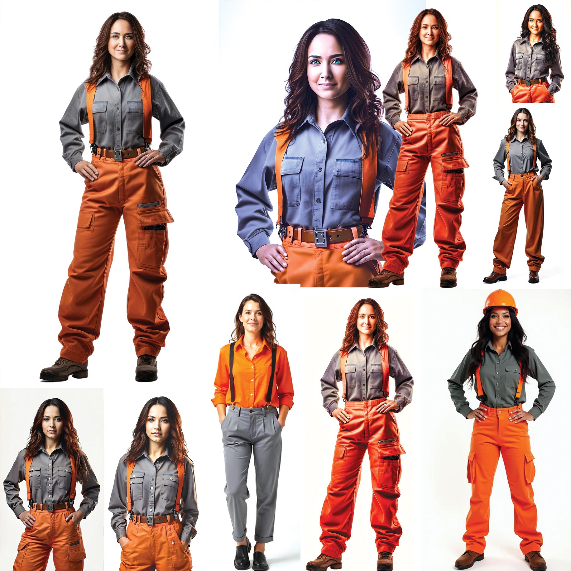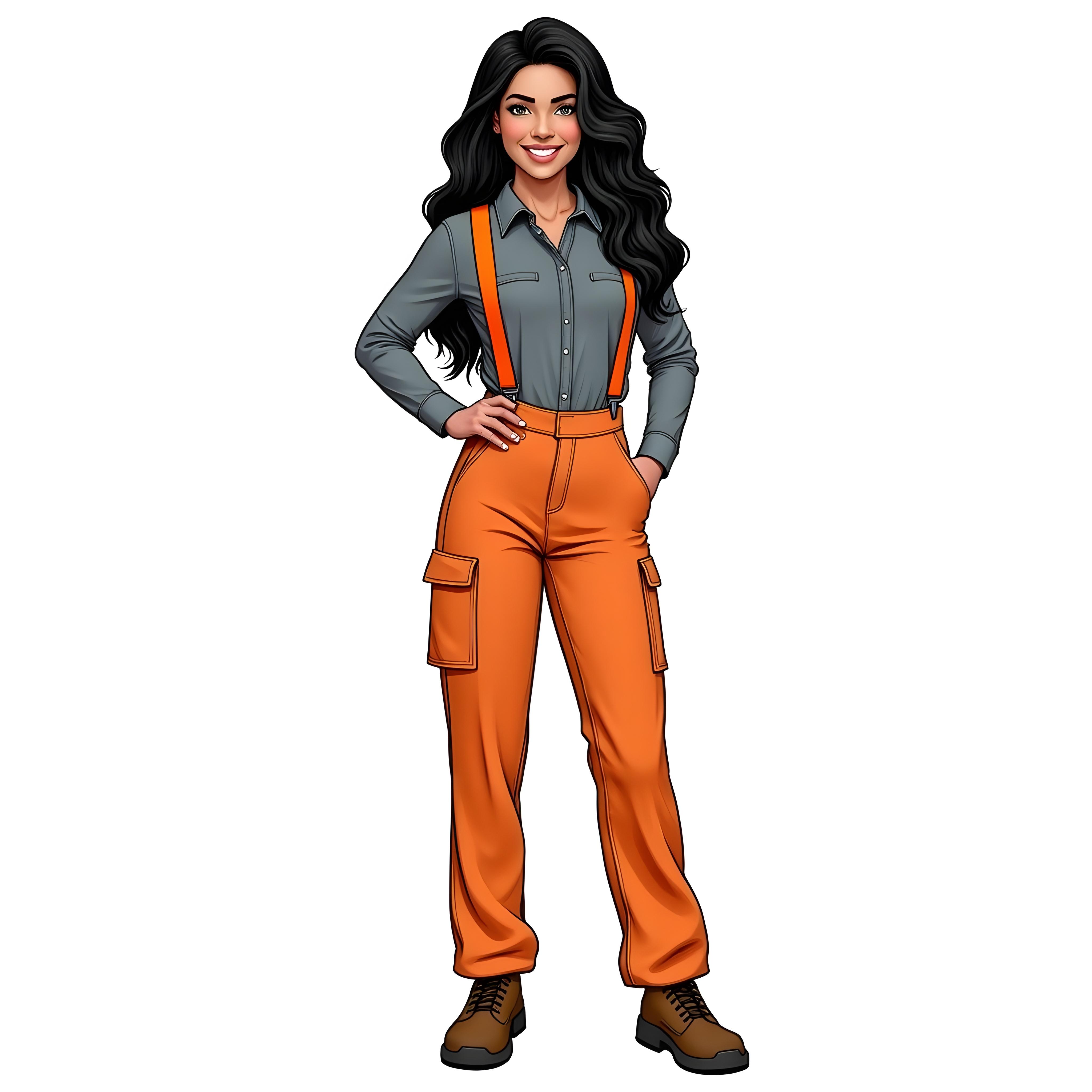 Foto de estúdio ultra-realista de corpo inteiro, com a modelo isolada em um fundo branco puro e área de respiro ao seu redor. A modelo é uma mulher brasileira de 40 a 45 anos, com pele morena clara e características étnicas sutilmente misturadas, incluindo leve influência asiática, representando a rica diversidade do Brasil. Ela tem olhos verde-esmeralda marcantes e expressivos — perfeitamente moldados, com detalhes nítidos de íris e reflexos de luz realistas. Suas sobrancelhas são naturalmente moldadas e cheias, e seus cílios são finamente detalhados, com fios individuais visíveis — sem manchas, sem distorção, sem joias ou piercings no nariz. Ela tem uma expressão amigável e confiante, sorrindo sutilmente e olhando diretamente para a câmera. Seu físico é atlético e sensual. Seu cabelo é longo, preto e brilhante, caindo naturalmente com ondas suaves e soltas nas pontas — suave, saudável e altamente detalhado. Sua pele é hiper-realista, com poros claramente visíveis, acabamento fosco, micro-imperfeições suaves com variações naturais de textura — incluindo reflexos leves e realistas. Sem efeito plástico, sem suavização, sem filtros de beleza artificiais. Esta é a pele humana renderizada em alta fidelidade. Ela está confiante com as mãos nos quadris, vestindo um uniforme profissional de engenheira civil: uma camisa de trabalho cinza de mangas compridas, abotoada, com gola estruturada, bolsos no peito e botões visíveis, não uma camiseta; calças cargo laranja de alta visibilidade; suspensórios laranja; cinto preto; e sapatos de trabalho marrons resistentes. A foto foi tirada em um ambiente de estúdio profissional com um fundo branco limpo e puro, uniformemente iluminado e totalmente isolado. Capturado usando uma Canon EOS R5 com uma lente 85mm f/1.4, ISO 100, velocidade do obturador 1/500s — estilo de fotografia de retrato ultra-nítido e de alta qualidade. A iluminação é suave e cinematográfica, com sombras equilibradas, realces suaves e alta faixa dinâmica. O foco é extremamente nítido nos olhos e no rosto, com exposição perfeita e tons de pele naturais. Resolução 8K ultra-detalhada e hiper-realista. Sem distorção, sem exagero. A imagem deve corresponder à pose, ao ângulo da câmera e ao estilo de roupa da imagem de referência fornecida.
